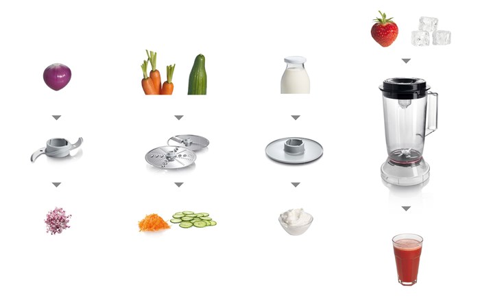 30'dan fazla özellik: paslanmaz çelik 6'lı bıçağı ve kullanışlı aksesuarlar sayesinde doğrama, rendeleme, karıştırma ve daha fazlası